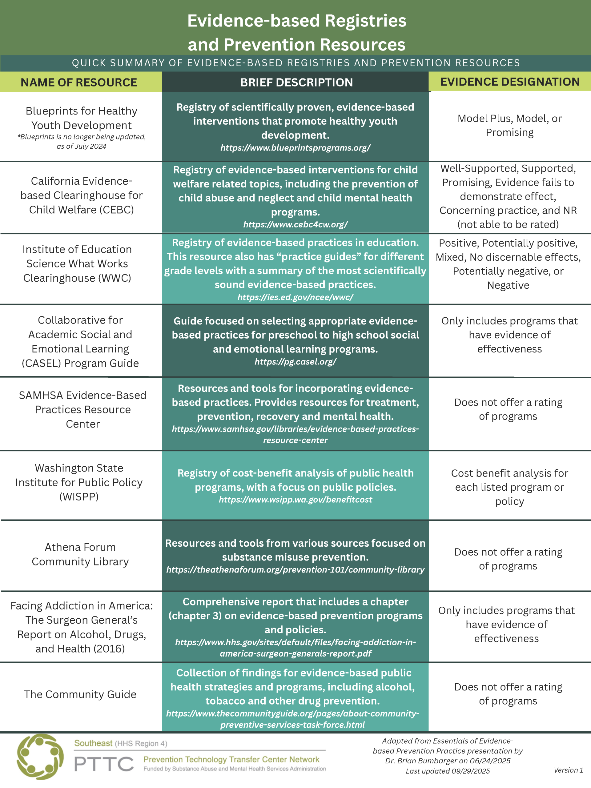 - PTTC Evidence-Based Registries and Prevention Resources List